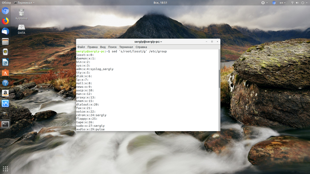 Здесь наоборот, опцию -n не указываем, чтобы выводилось всё, а с помощью команды d очищаем ненужное. Дальше рассмотрим замену в sed. Это самая частая функция, которая применяется вместе с этой утилитой. Заменим вхождения слова root на losst в том же файле и выведем всё в стандартный вывод: