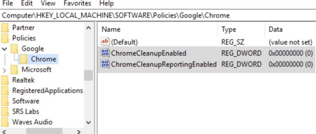 - Создаем элемент ChromeCleanupReportingEnabled, а затем ChromeCleanupEnabled.