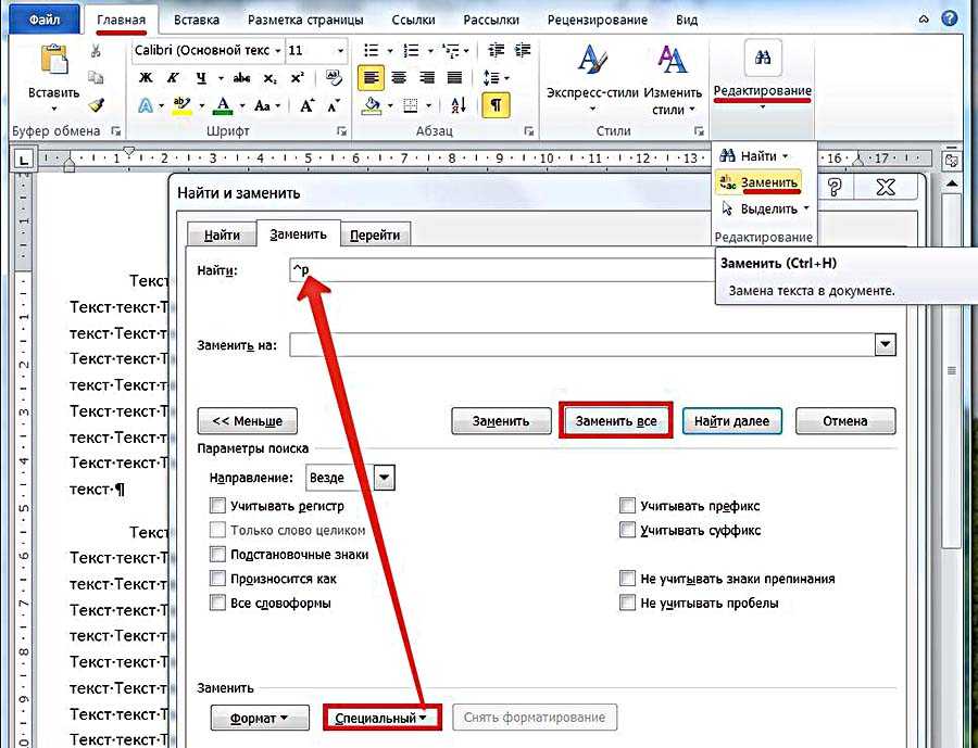 - Открыть список «Специальный» и выбрать в нём первый пункт «Знак абзаца». На строке «Найти» появится специальный символ;
