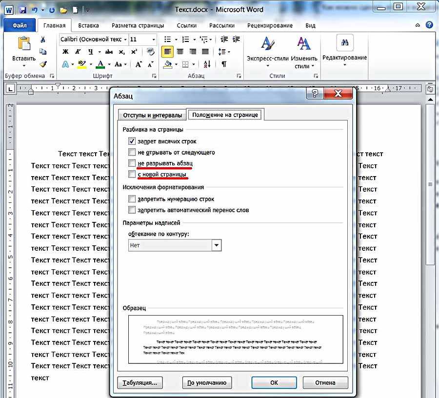 Для того чтобы сделать неразрывный абзац в Ворде , откройте диалоговое окно, показанное выше. В нем перейдите на вкладку «Положение на странице» и поставьте галочку в поле «не разрывать абзац» . Нажмите «ОК» .