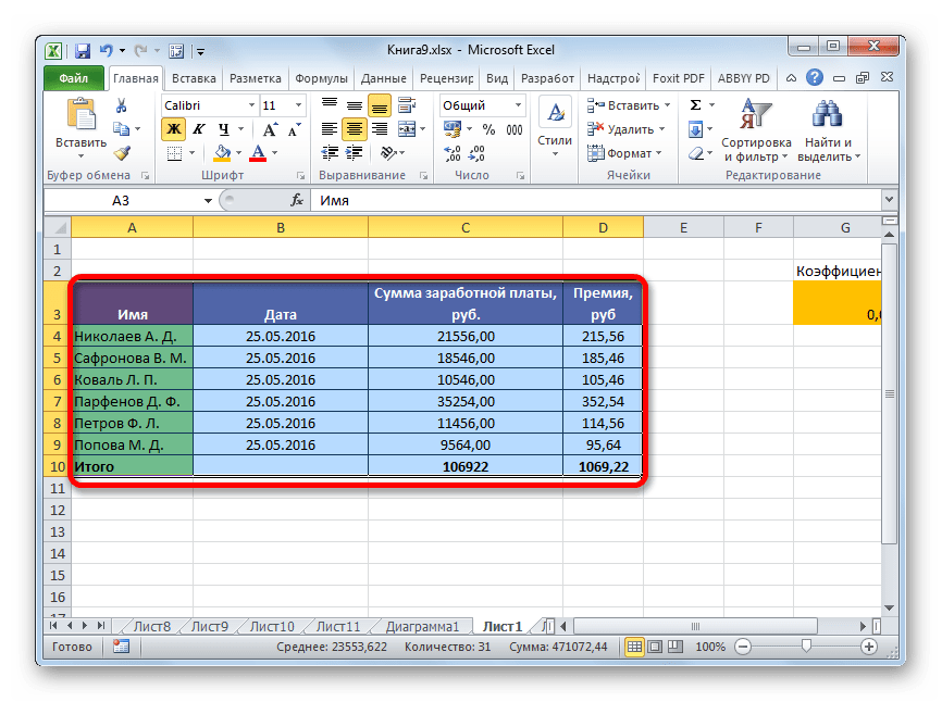 Наиболее распространенный вариант выделения таблицы, которым пользуются практически все пользователи – это применение мышки. Способ максимально прост и интуитивно понятен. Зажимаем левую кнопку мыши и обводим курсором весь табличный диапазон. Процедуру можно производить как по периметру, так и по диагонали. В любом случае, все ячейки данной области будут отмечены.