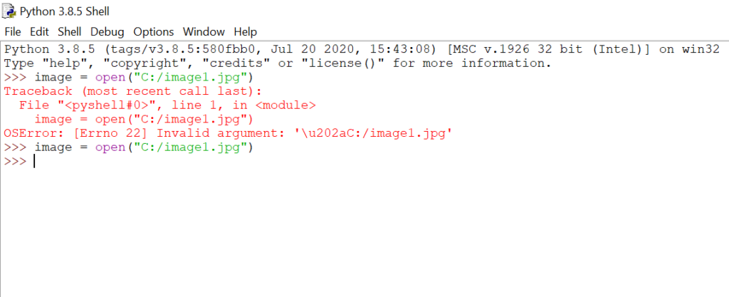 The above error can appear while opening an image using the open() function even though the backslash character has been replaced with forward slash. Let us see the error using an example.