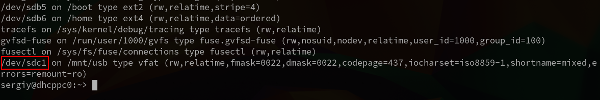 Как видите, здесь мы можем посмотреть детальную информацию об устройстве. Имя файла, список разделов, формат таблицы разделов, список разделов. А главное для нас, размер раздела и его файловую систему. Теперь не сложно понять какая из них флешка. В этом примере это /dev/sdc1