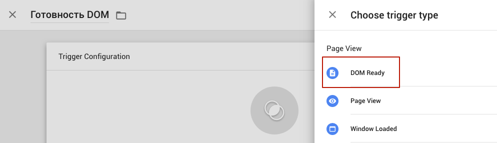 И добавляем (плюсик +) еще один триггер DOM Ready (Готовность DOM). Это означает, что наш скрипт будет срабатывать только после того, как загрузится вся страница.