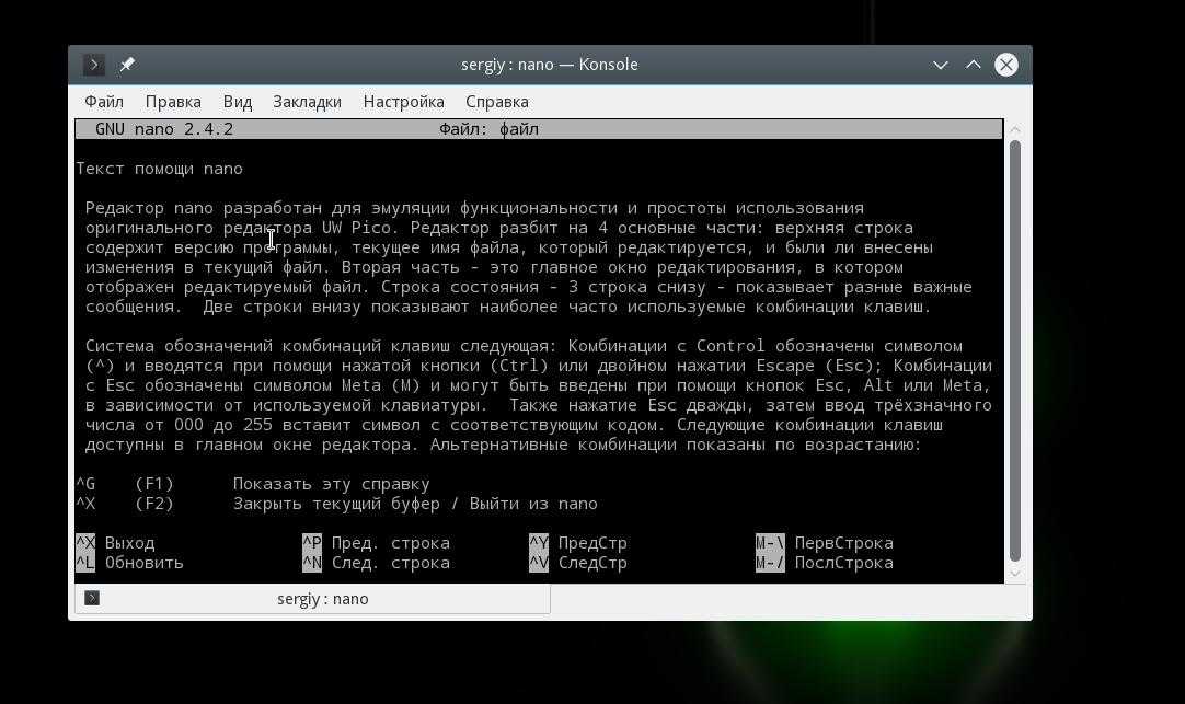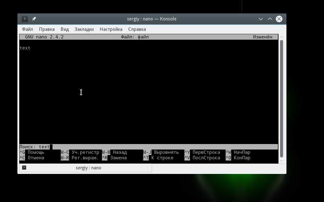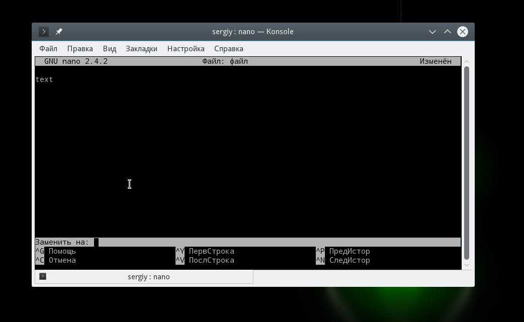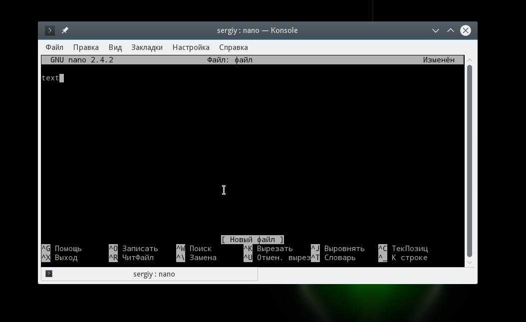 Чтобы открыть какой-либо файл, достаточно передать его в параметрах команде nano. Если такого файла не существует, будет создан новый. Например: