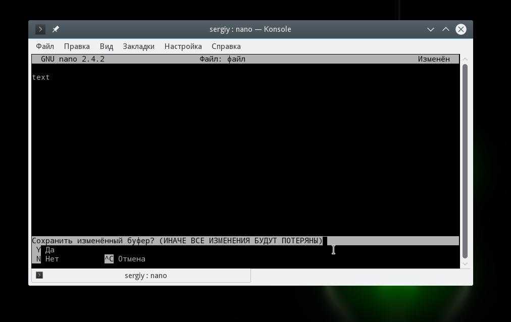 Перед тем как закрывать программу, нужно сохранить изменения в файл на диске. Для этого используйте сочетание Ctrl+O. Если вы запустили nano без параметров, вам нужно будет ввести имя файла.