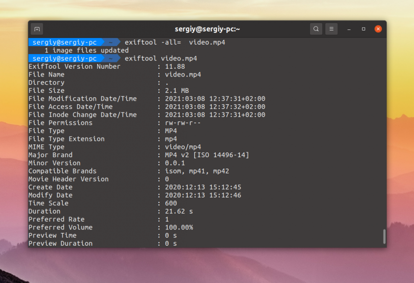 Теперь здесь больше нет никаких геоданных, остались только стандартные значения тегов, взятые из медиа файла, без которых обойтись нельзя. Если вы хотите удалить метаданные из всех файлов в папке просто используйте символ звездочки. Например, для всех mp4 файлов: