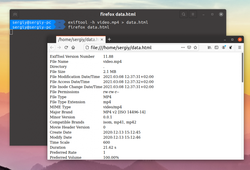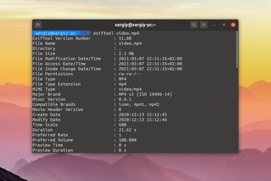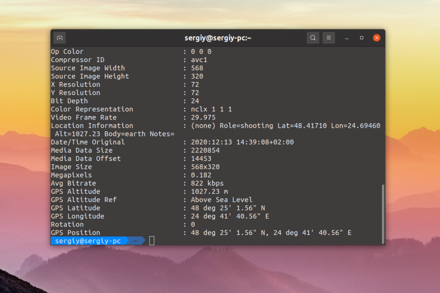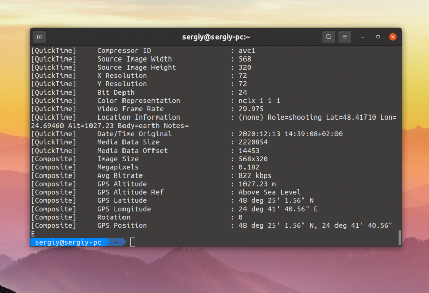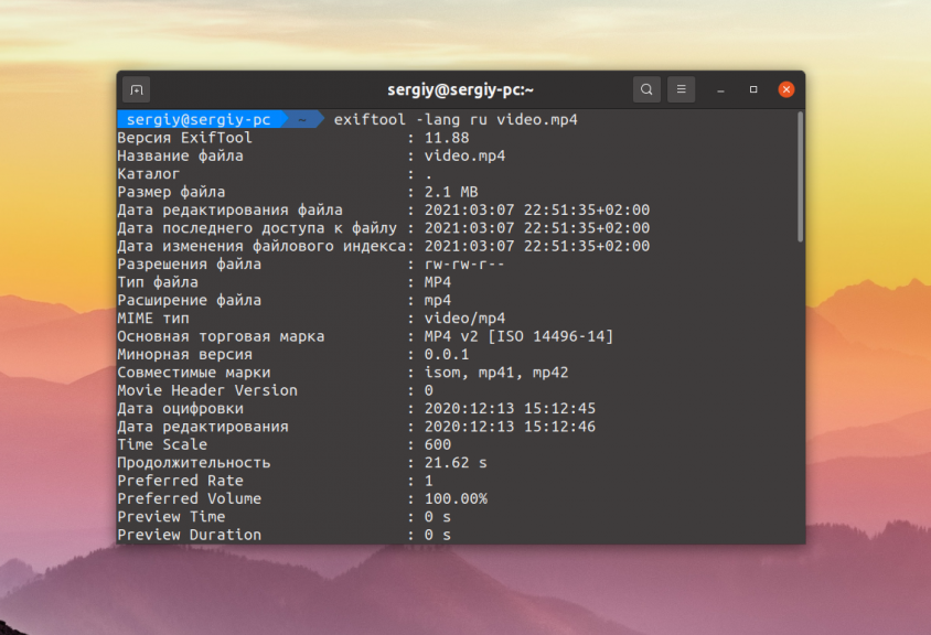 Давайте попробуем прочитать метаданные из видео файла. Для этого просто передайте путь к нему программе: