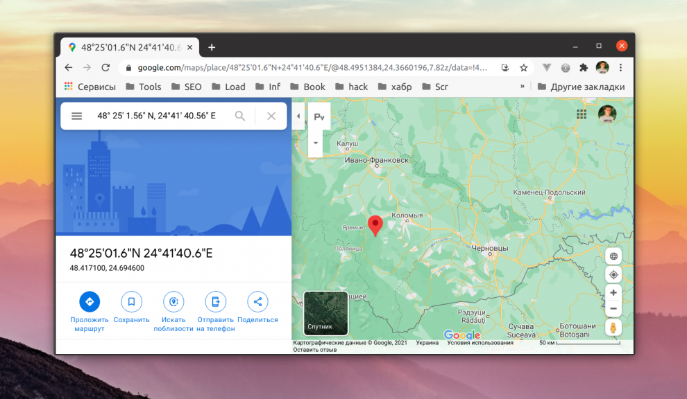 Теперь можно скопировать значение поля GPS Position, где все эти данные собраны вместе, заменить deg на знак градуса и просто ввести в поиск Google карт. На карте будет показано место где было сделано фото или видео. Например: 48° 25′ 1.56″ N, 24°41′ 40.56″ E: