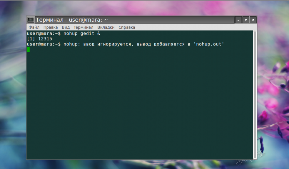Второй способ сохранить запущенные процессы после прекращения работы терминала — команда nohup. Она выполняет другую команду, которая была указана в качестве аргумента, при этом игнорирует все сигналы SIGHUP (те, которые получает процесс при закрытии терминала). Для запуска команды в фоновом режиме нужно написать команду в виде: