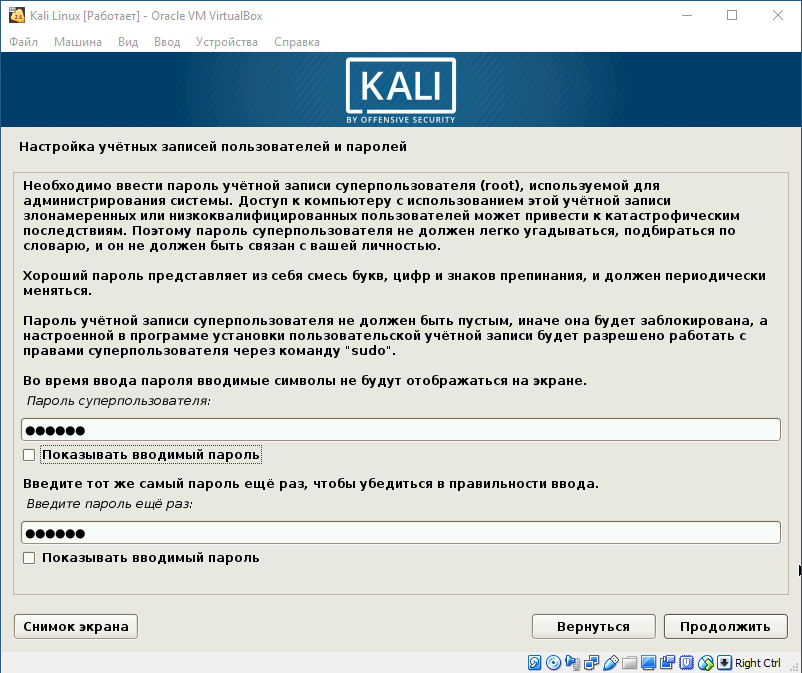 Настраиваем пароль учетной записи. Примечание: следует запомнить, что при вводе пароля в @root консоли, символы отображаться не будут.