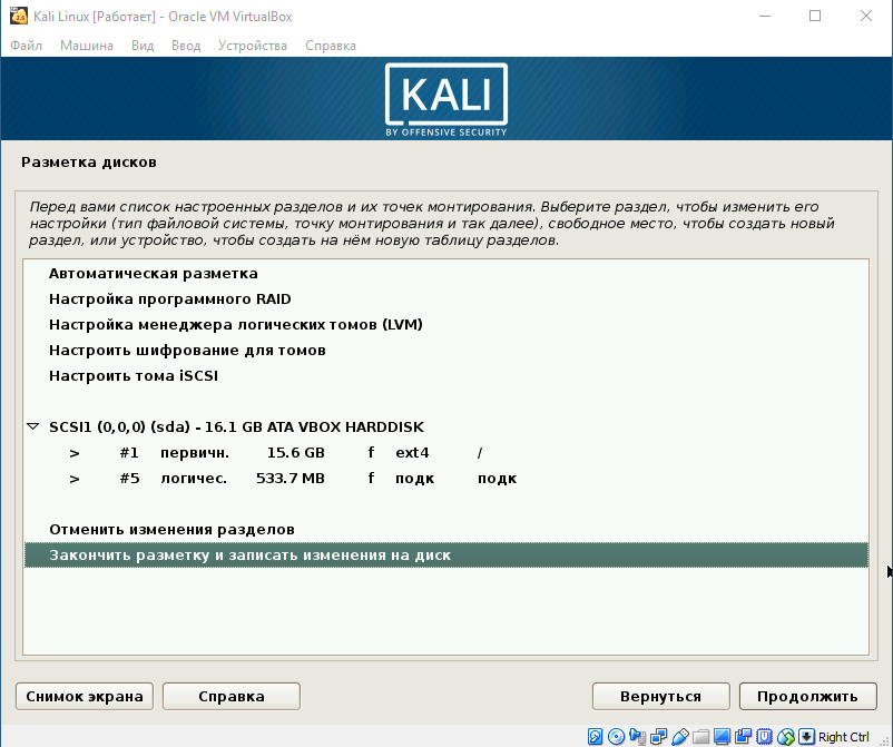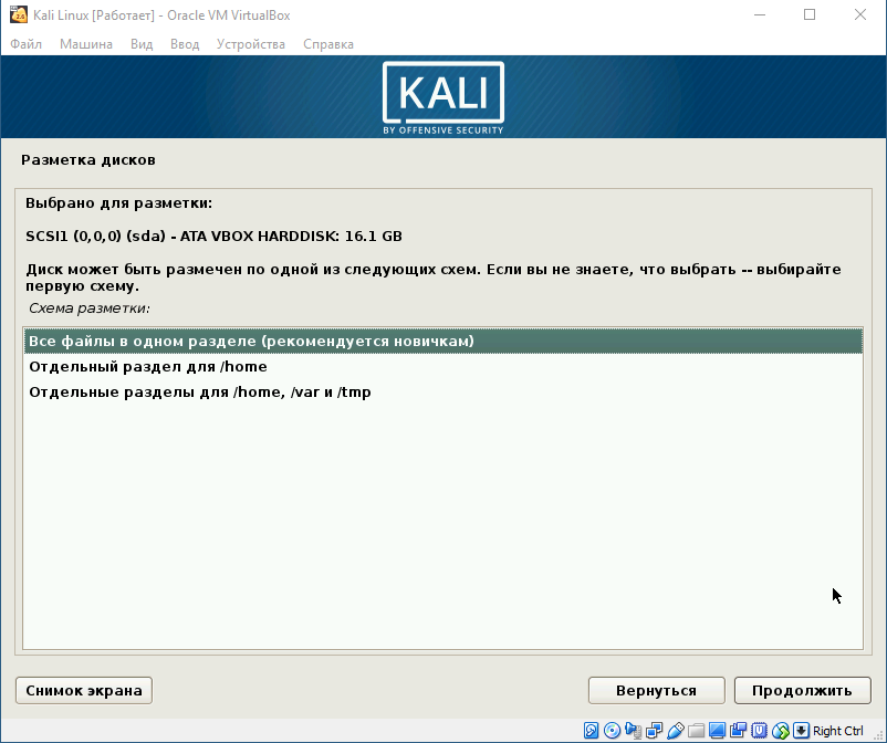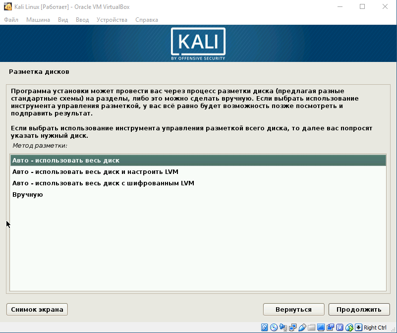 Теперь предстоит выполнить разметку дисков. Так как установка Kali Linux происходит на VirtualBox, то мы используем весь диск.