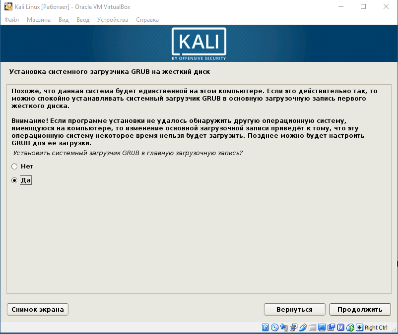 Далее идет установка системного загрузчика GRUB. Оставляем «Да» и продолжаем установку.