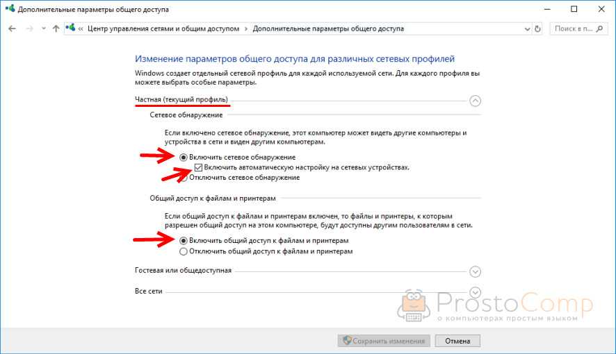 Дальше для текущего профиля (скорее всего это будет частная сеть) установите переключатель возле «Включить сетевое обнаружение» и «Включить общий доступ к файлам и принтерам». А так же поставьте галочку возле «Включить автоматическую настройку на сетевых устройствах».