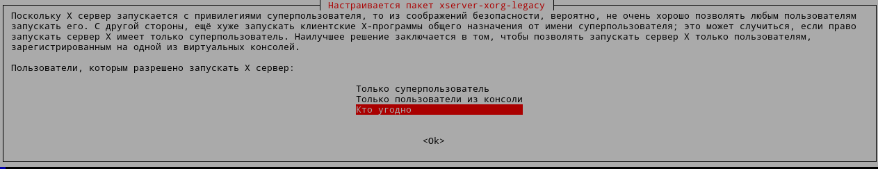 Для изменения прав доступа к запуску X сервера необходимо выполнить следующую команду: