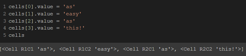 5. Таким образом мы создаем список ячеек с индексами (R1C1) и значениями (на данный момент пустыми). Можно изменить отдельные ячейки, обновив их атрибут значения: