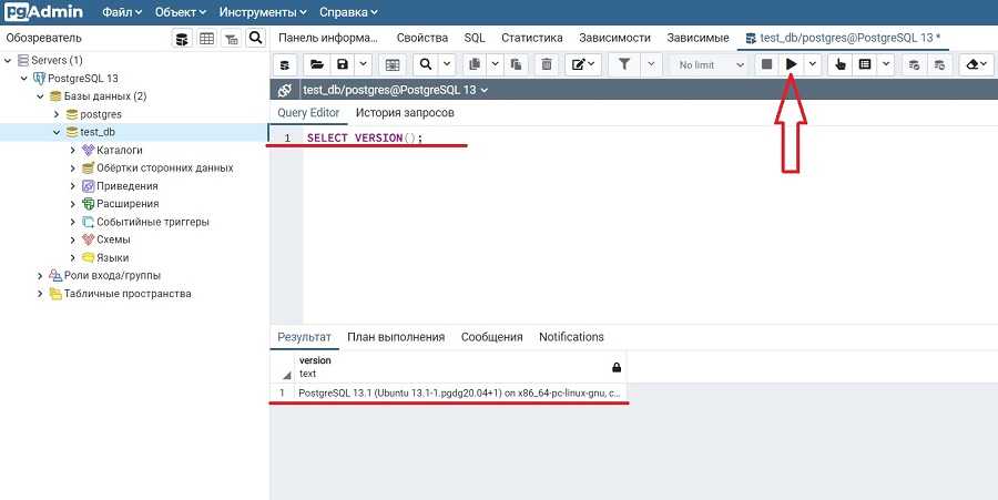Чтобы убедиться в том, что все работает, давайте напишем простой запрос SELECT, который покажет нам версию сервера PostgreSQL.