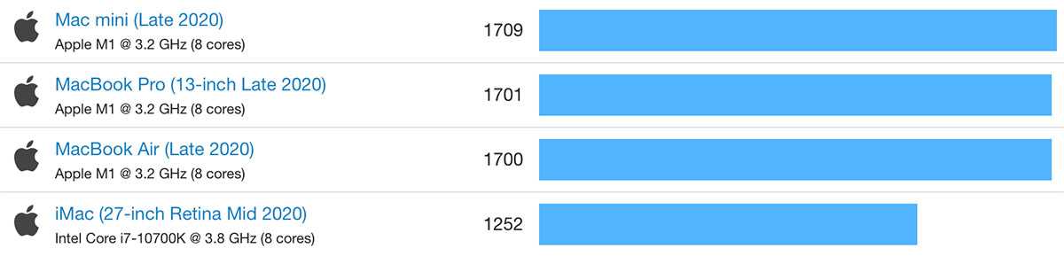Сравнение производительности всех ядер на чипах M1 и Intel, больше — лучше