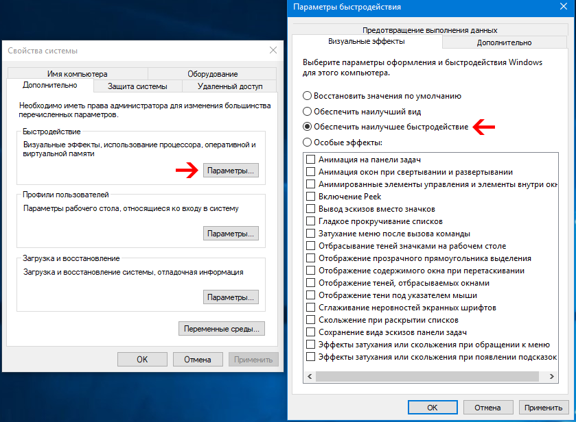 2. «Дополнительно» — «Быстродействие» — «Параметры».