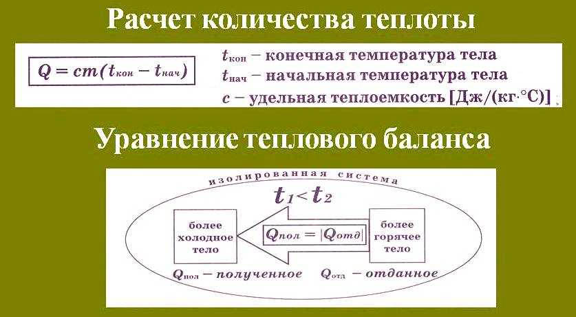 Количество теплоты Q, необходимое для нагревания тела массой m от температуры t1°С до температуры t2°С, равно произведению удельной теплоёмкости вещества, массы тела и разности конечной и начальной температур, т.е.