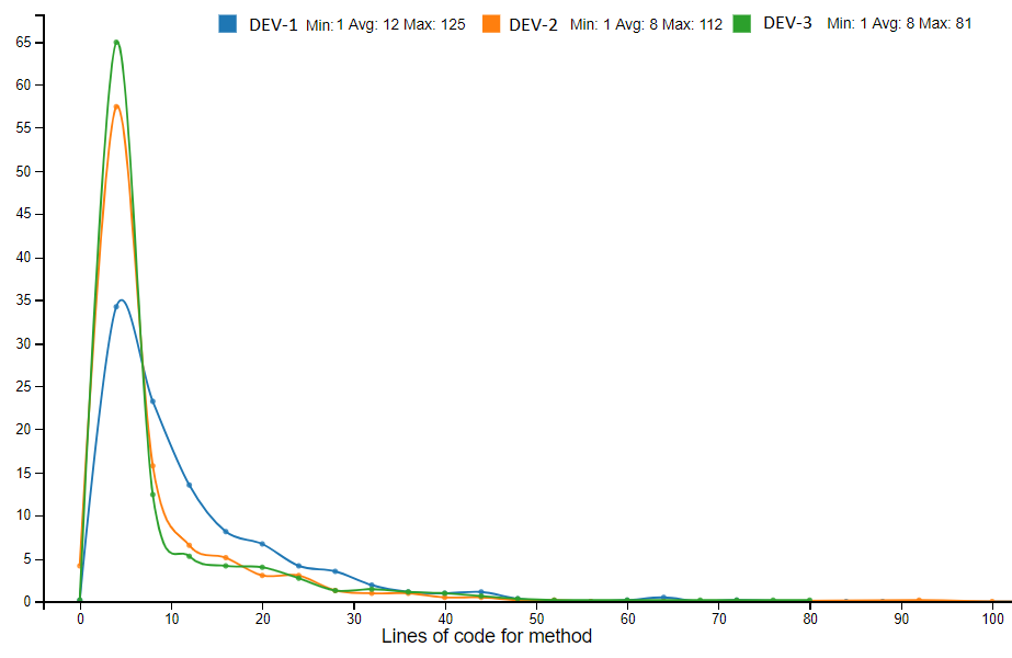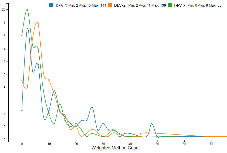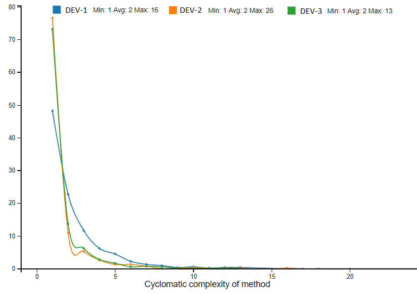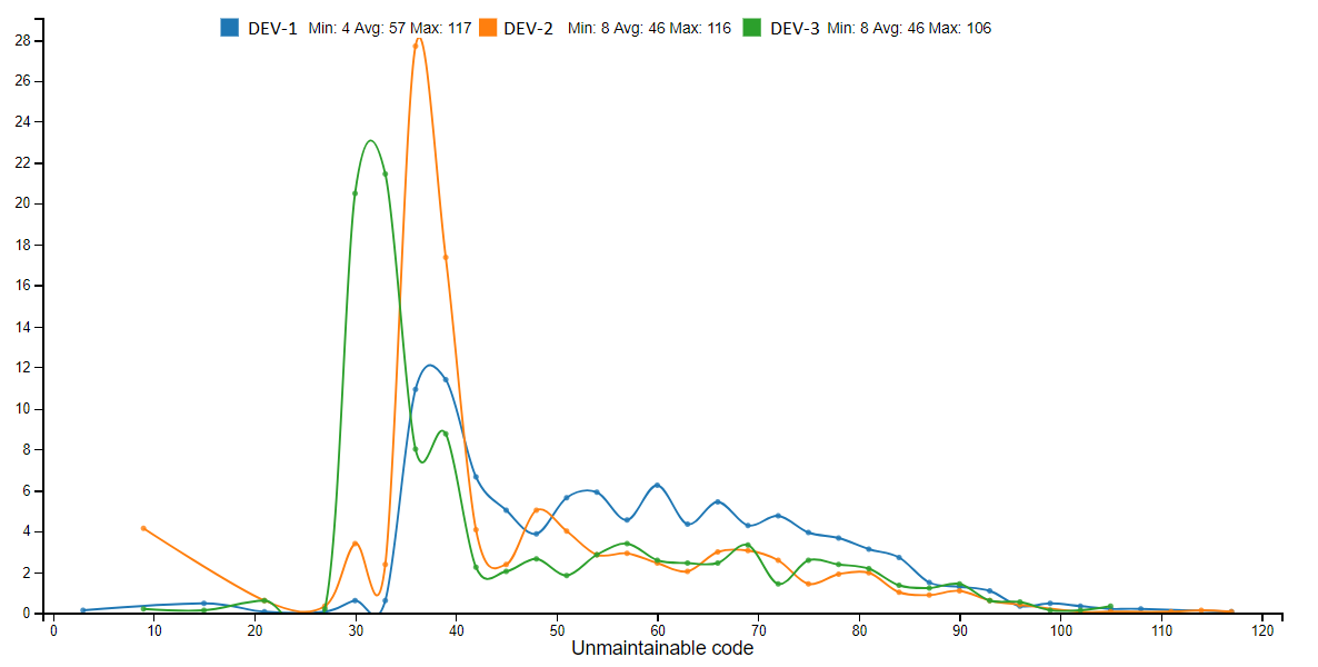 Как видно из графиков, синяя кривая находится выше, что означает более сложный код, написанный программистом DEV-1. Программисты DEV-2 и DEV-3 пишут код примерно одинаковой сложности. Формально все они имеют одну и ту же квалификацию, но анализ показывает, что между их кодом есть ощутимая разница. Особенно интересны эти данные, когда тебе известен опыт людей, отношение к ним в коллективе и их самооценка.