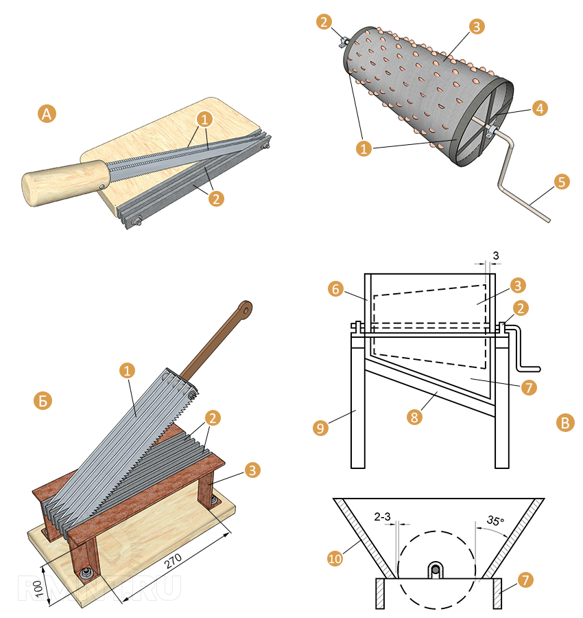 На первом рисунке ножи сделаны из старых, односторонне заточенных пил, на втором — ножи и пластины изготовлены из полотна пилорамной пилы. На ножах выточены косые зубья, как у пилы, с шагом 5 мм. Оба измельчителя оснащены длинными рукоятками для облегчения усилия. Рабочая часть третьей конструкции выполнена в виде барабана с насечками, острые края которых торчат наружу.