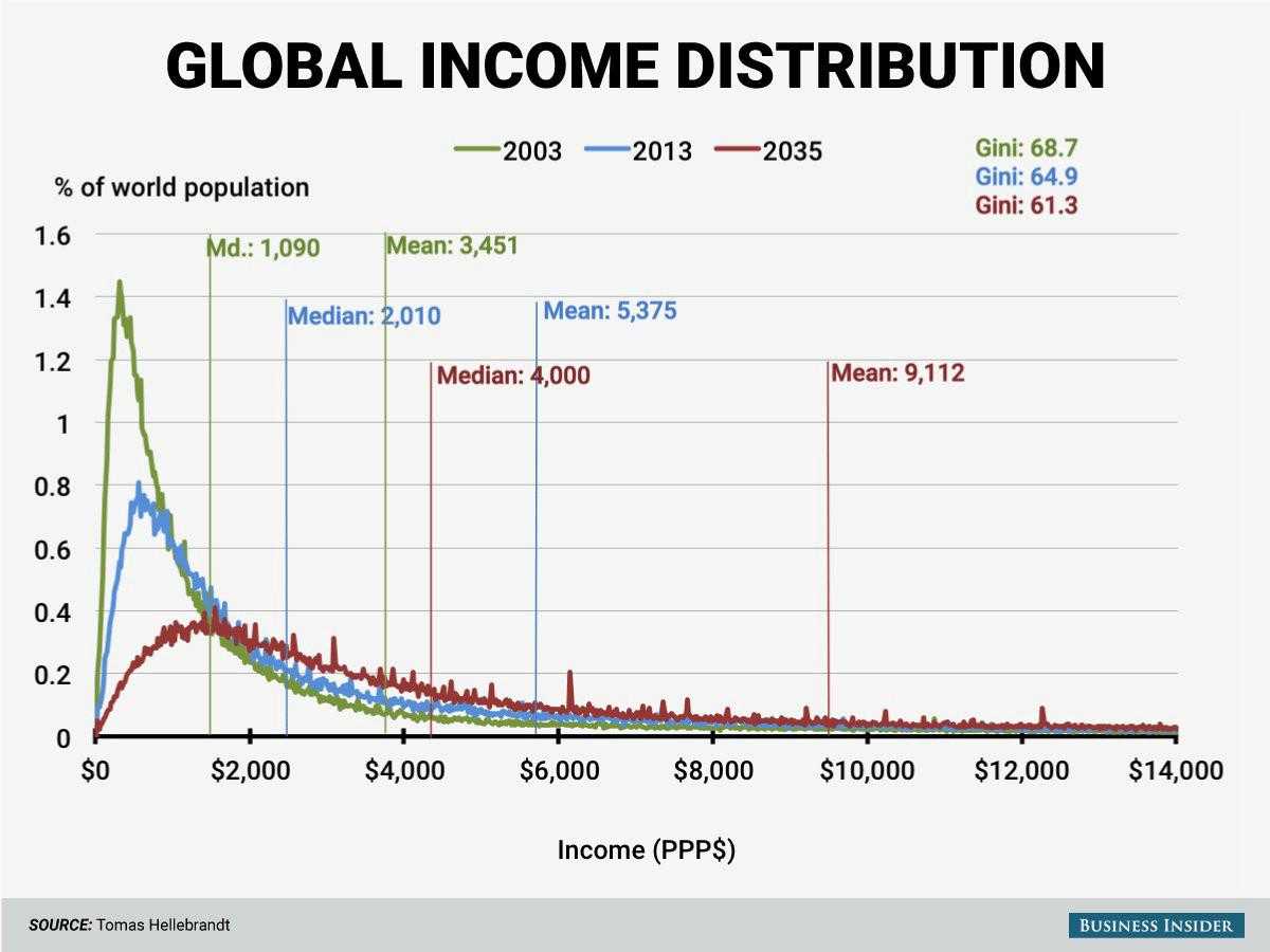 Например: глобальное распределение доходов в 2003 году сильно искажено. Мы видим, что среднее значение 3451 доллара в 2003 году (зеленый цвет) больше среднего значения в 1090 долларов. Это говорит о том, что мировой доход распределяется неравномерно. Доход большинства людей составляет менее 2000 долларов и меньше людей с доходом выше 14000 долларов, поэтому асимметрия. Но, похоже, к 2035 году, согласно прогнозу, неравенство в доходах со временем уменьшится.