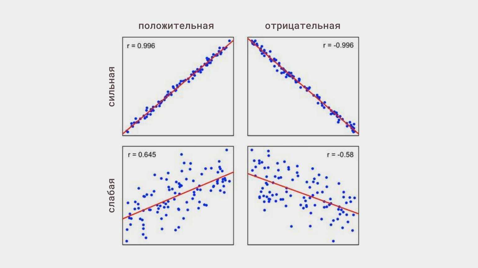 Линейная корреляция — это когда изменения одной величины пропорциональны изменениям другой. Она может быть: