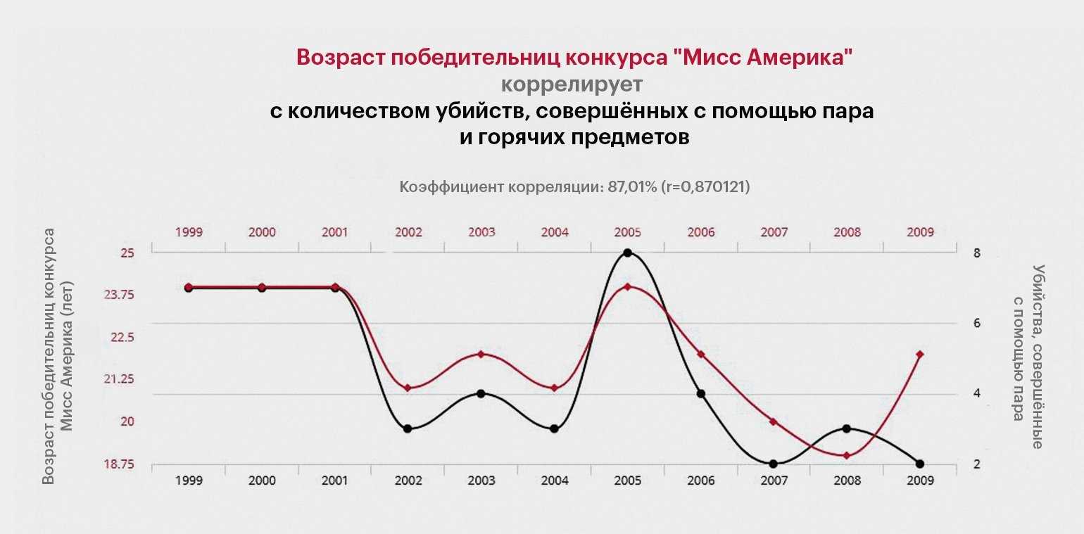 Возраст победительниц конкурса «Мисс Америка» и количество убийств, совершённых с помощью пара и горячих предметов. Изображение: Tyler Vigen / Spurious Correlations