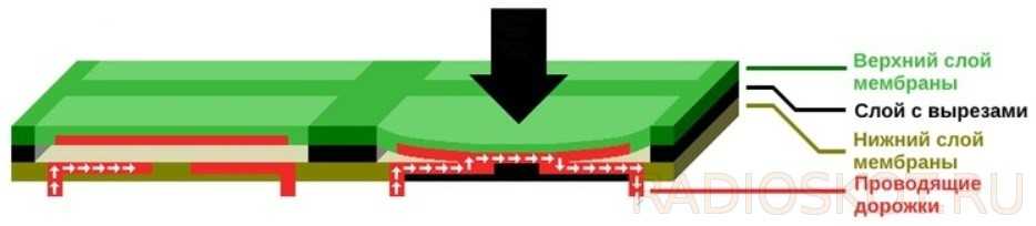 Она состоит из склеенных между собой тонких диэлектрических и проводящих слоев. Нажатие на поле заставляет два слоя укорачиваться соединяясь вместе, тем самым замыкая цепь кнопки. Эти типы клавиатур, помимо компактности, отличаются невысокой ценой. Но это связано с пониженным комфортом пользователя — малый ход и как правило отсутствие тактильной связи ухудшают комфорт использования. С другой стороны, механические клавиатуры, обеспечивающие заметный ход, обеспечивают гораздо больший комфорт, но они дороже и сложнее в изготовлении.