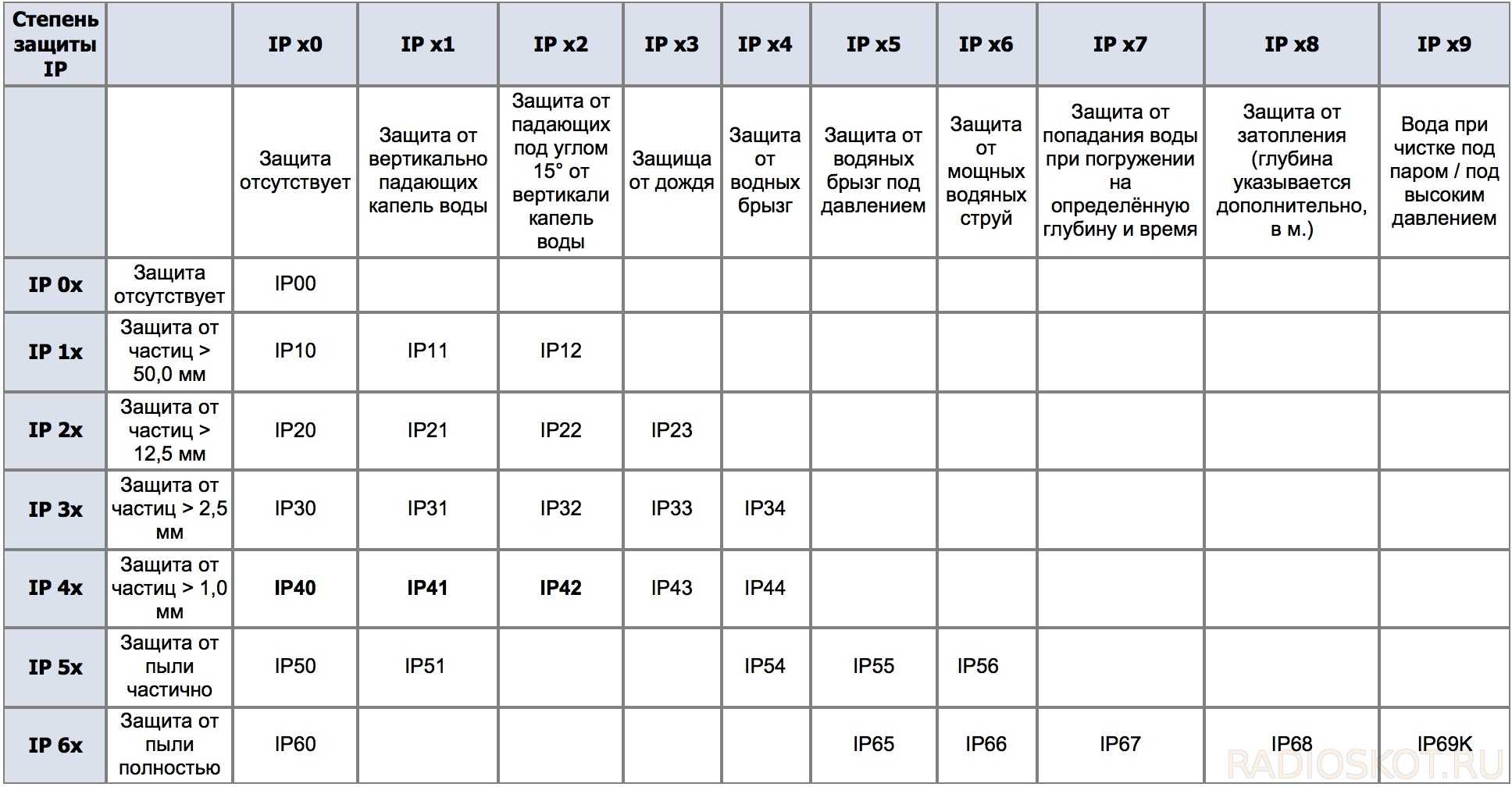Самый низкий класс защиты IP00 означает устройство без защиты от доступа внутрь, в данном случае кнопки. Класс защиты указывает например размер тел, которые могут попасть внутрь кнопки, или защиту от пыли. В случае защиты от проникновения воды уровни защиты меняются начиная от капель воды (степень 1) до защиты от затопления мощной струей воды под давлением (100 бар при температуре 80 ° C). в соответствии с DIN 40050 (класс 9). Самый высокий класс защиты — IP69.