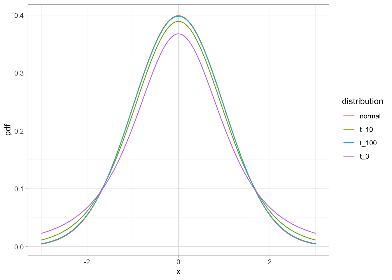 Форма этого распределения очень похожа на форму нормального распределения, но имеет более тяжелые “хвосты” распределения. При этом эта форма зависит от размера выборки: чем больше выборка, тем ближе распределение к нормальному. Этот параметр распределения называется степенями свободы (degrees of freedom) и вычисляется как \(N — 1\), где \(N\) — это размер выборки.