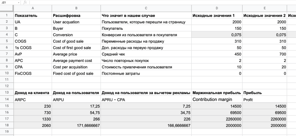 Доход на одного пользователя. В таблицу внесены готовые формулы для расчета показателей ARPU, ARPС и ARPU − CPA. Изменяйте исходные значения и смотрите, как меняется прибыль компании.