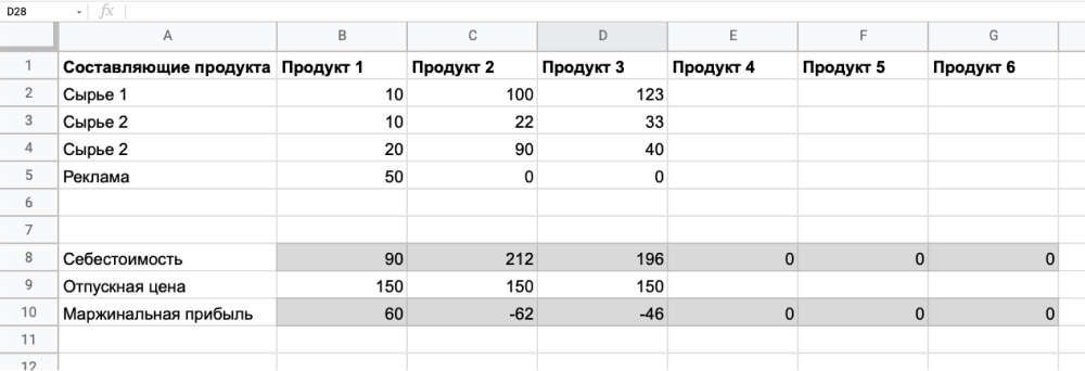 Себестоимость. Разложите продукт на составляющие. Укажите отпускную цену. Себестоимость и маржинальная прибыль рассчитываются автоматически.