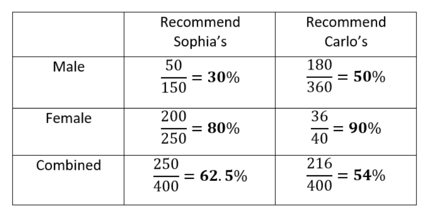 Оба факультета принимают одинаковые доли женщин и мужчин. Однако поскольку абсолютное количество мужчин было больше на факультете с более высоким процентом принятых, если объединить данные, получится, что в целом процент поступления мужчин выше.