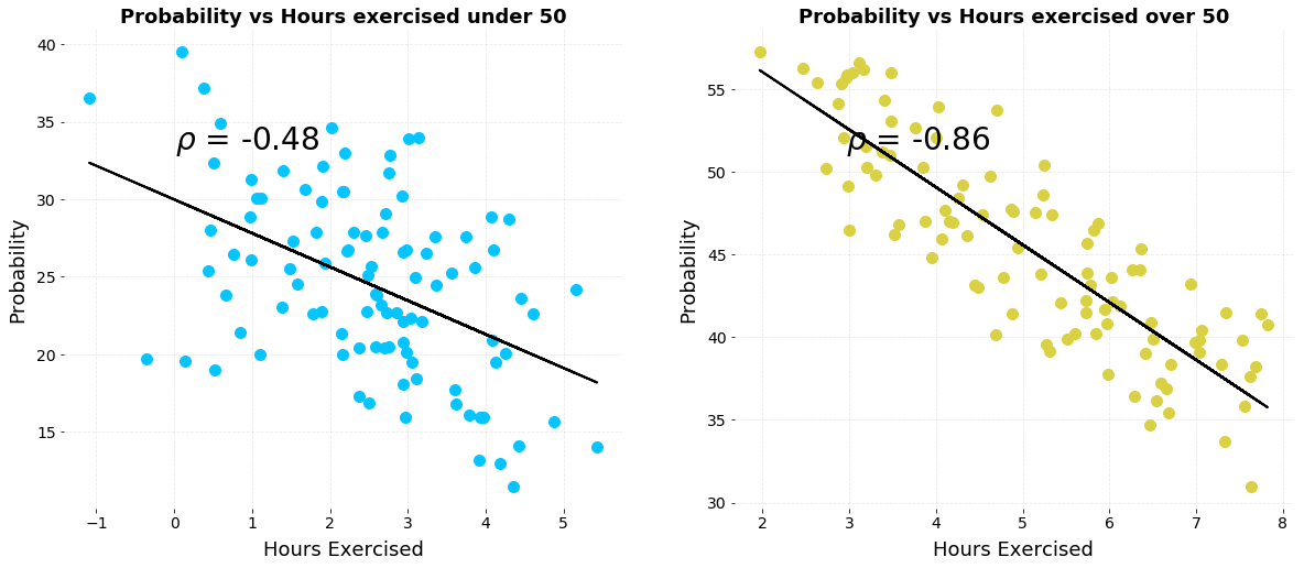 Другая интригующая версия парадокса Симпсона возникает, когда корреляция, которая указывает в одном направлении в стратифицированных группах, становится корреляцией впротивоположное направлениекогда агрегировано для населения. Давайте посмотрим на упрощенный пример. Скажем, у нас есть данные о количестве часов физических упражнений в неделю в зависимости от риска развития заболевания для двух групп пациентов, тех, кто моложе 50 лет и старше 50 лет. Вот отдельные графики, показывающие взаимосвязь между физической нагрузкой и вероятность заболевания.