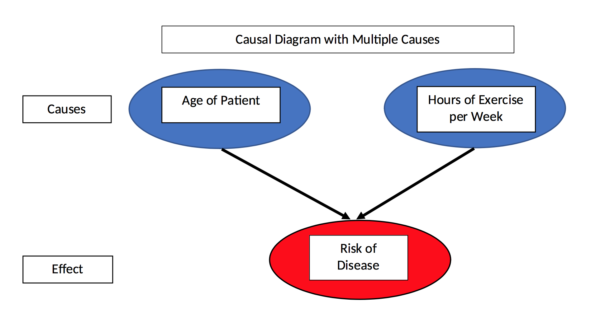 В примере «упражнение против болезни» мы интуитивно знаем, что физические упражнения не являются единственным фактором, влияющим на вероятность развития заболевания. Существуют и другие факторы, такие как диета, окружающая среда, наследственность и так далее. Тем не менее, на графиках выше, мы видимтольковероятность против часов упражнений В нашем вымышленном примере давайте предположим, что болезнь вызвана как физическими упражнениями, так и возрастом. Это представлено в следующей причинно-следственной модели вероятности заболевания.