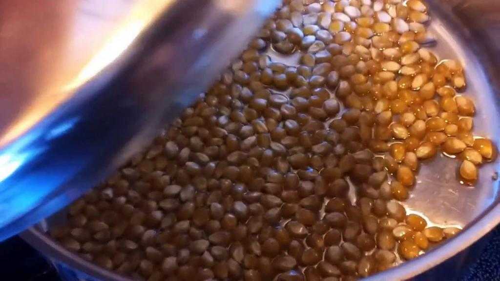 - Все зерна должны лежать на сковороде в один ряд и прикасаться одной стороной к металлу сковороды или кастрюли — это даст гарантию того, что все зерна раскроются.