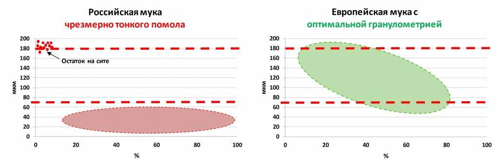В качестве косвенного показателя гранулометрии в России контролируется Остаток на сите и Проход через сито в зависимости от сорта муки. Муку повсеместно измельчают практически до состояния пыли в целях достижения наибольших выходов и белизны (рисунок 6, красный график). Такой подход мукомолов ставит российских хлебопеков в жесткую зависимость качества выпечки от Числа падения. Даже небольшое изменение ЧП на 20-30 сек. может привести к резкому скачку брака готовой продукции. Это обусловлено высокой атакуемостью разрушенного крахмала собственными амилазами, а также амилазами в составе хлебопекарных улучшителей. В следствие низкой гранулометрии российская мука характеризуется крайней нестабильностью на разных пищевых производствах.