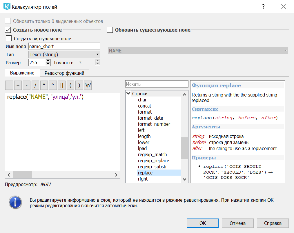 В окне задайте название добавляемого атрибута, его тип данных, и формулу. Просмотрите список функций — при нажатии по ним открывается описание.