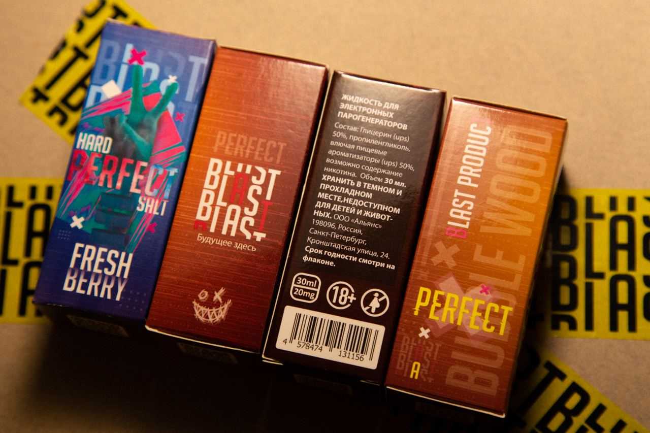Серия вкусов Perfect поставляется в глянцевых картонных коробках. Цветовая гамма оформления зависит от выбранного сочетания. На лицевой стороне расположено название линейки, название вкуса, а также изображение соответствующее сочетанию. Правая грань выделена под логотип производителя, а левая под крупное название линейки и вкуса. Четвертая грань отведена под информационный блок: состав, баланс, объем, предупреждения, юридические данные, маркировки и штрихкод. На верхней крышке дублировано название вкуса, а на противоположенной – QR-код, ведущий на официальную группу производителя.