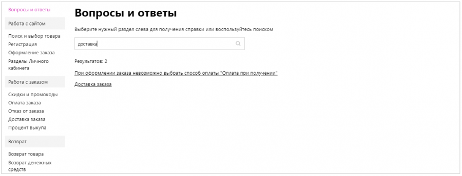 3. Если FAQ содержит много вопросов, для удобства их целесообразно группировать в категории: оплата, доставка, информация о товаре, использование и т.д. Большие FAQ не лишним будет дополнить внутренним поиском — с ним пользователи смогут искать ответы более простым и удобным способом.
