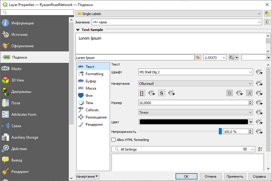 - Для слоя дорожной сети: подписи по полю , кегль (размер) шрифта — 8 типографских пунктов, остальные параметры по умолчанию;
