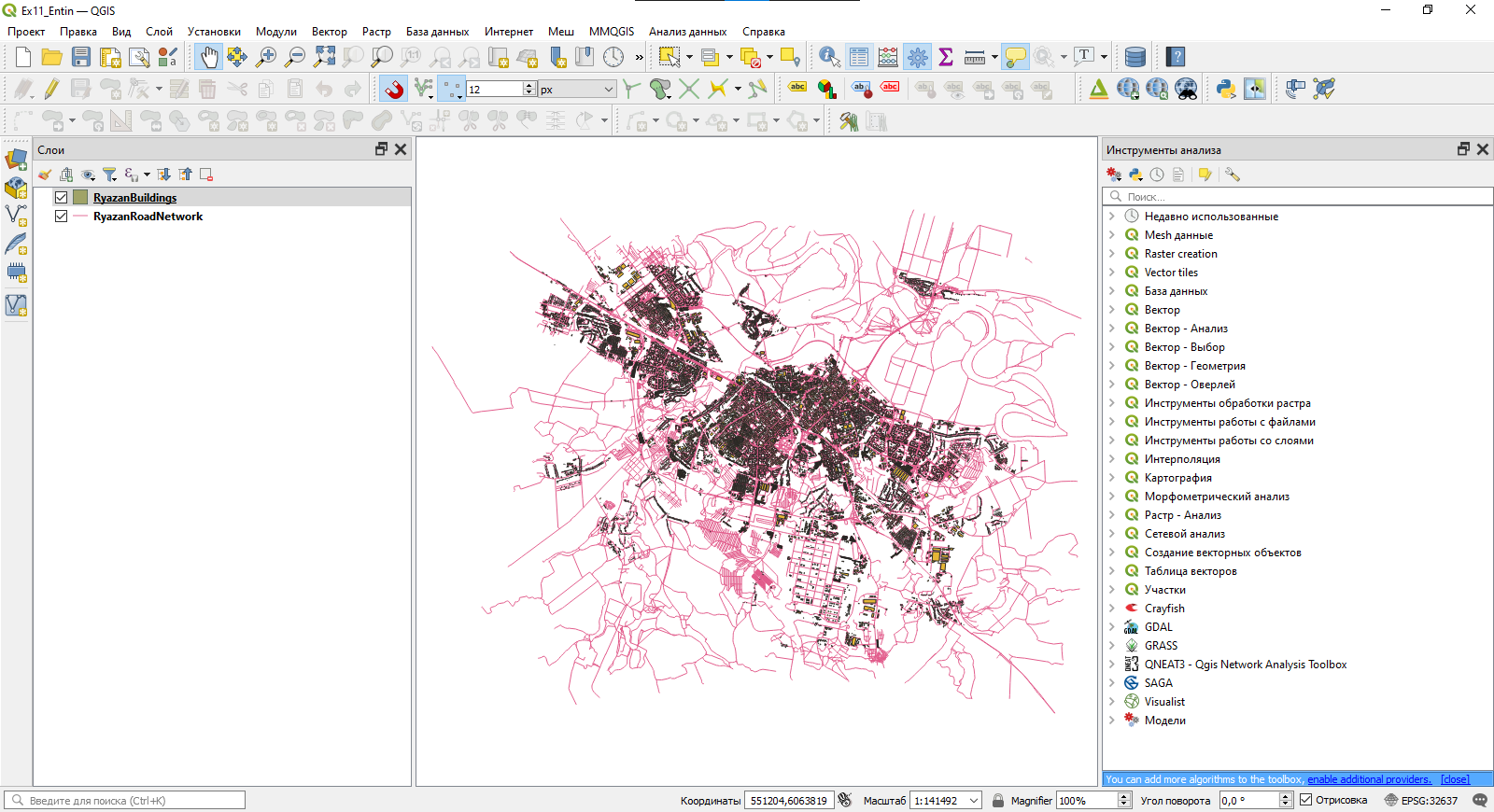 Добавьте в проект слои RyazanRoadNetwork (улично-дорожная сеть) и RyazanBuildings (здания и сооружения). Оба этих слоя подготовлены на основе данных OpenStreetMap