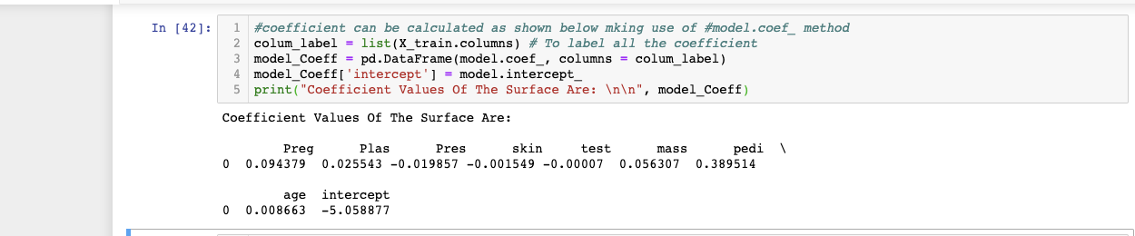 #coefficient can be calculated as shown below making use of #model.coef_ methodcolum_label = list(X_train.columns) # To label all the coefficientmodel_Coeff = pd.DataFrame(model.coef_, columns = column_label)model_Coeff = model.intercept_print("Coefficient Values Of The Surface Are: ", model_Coeff)