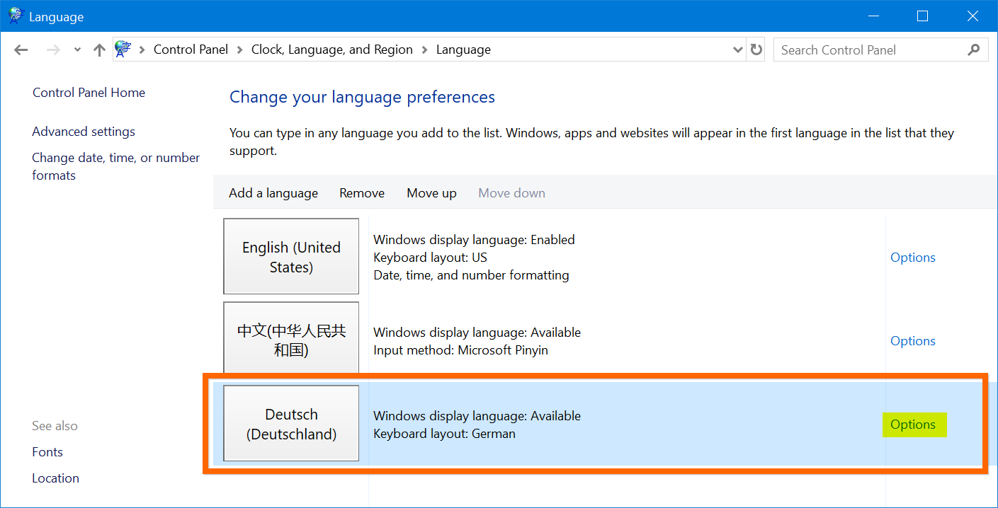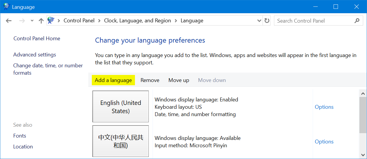 Вы можете щелкнуть ссылку «Дополнительные настройки» на правой боковой панели раздела «Язык панели управления», чтобы настроить дополнительные параметры для языков отображения и методов ввода.