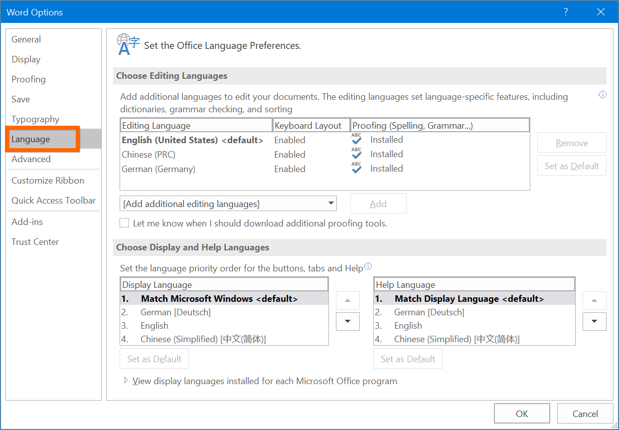 Если на вашем компьютере установлено несколько языков, вы можете настроить язык для редактирования в пакете Office, таком как Word, Outlook и PowerPoint.