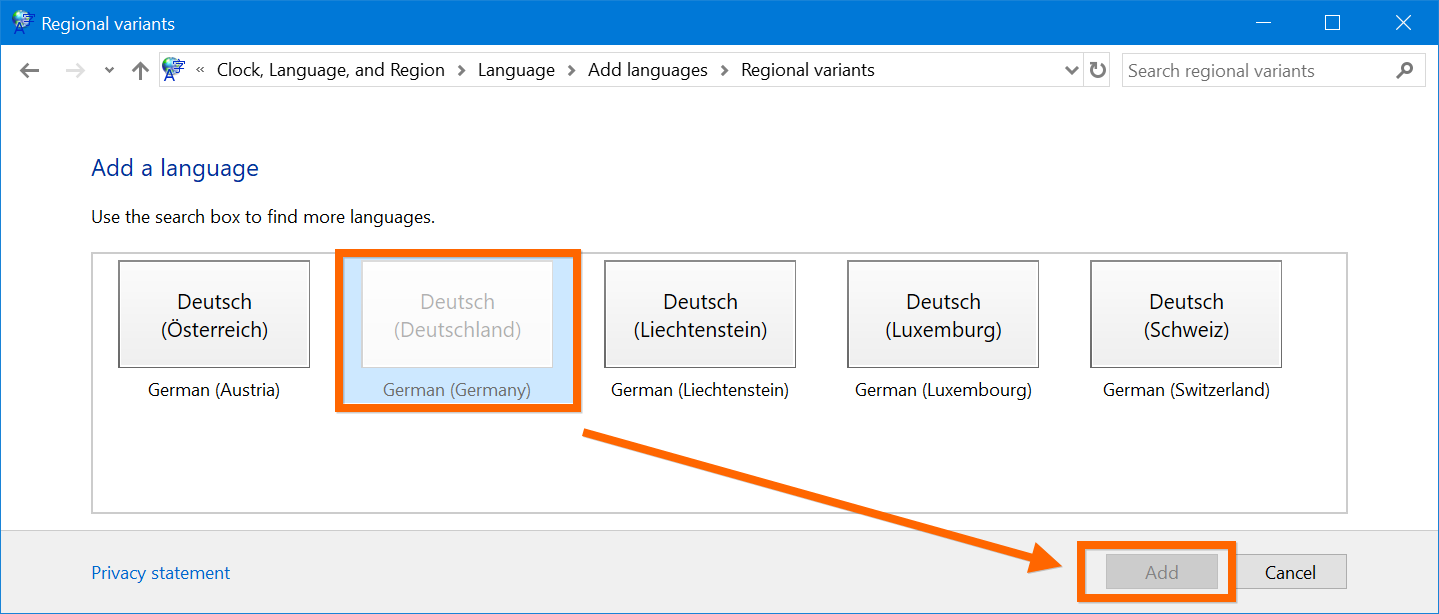 - нажмите на Добавление языка и выберите нужный вам;
