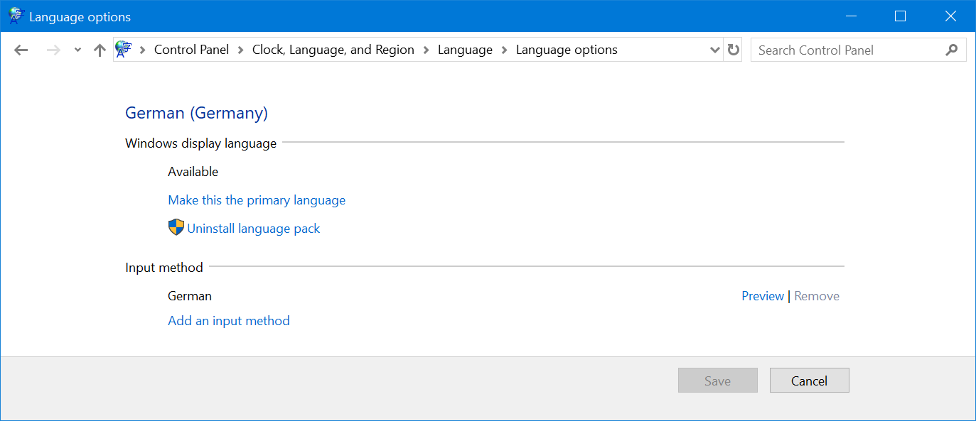 - Перейдите в раздел «Панель управления Часы, язык и регион Язык Параметры языка» и нажмите «Удалить языковой пакет», чтобы полностью удалить установленный языковой пакет.