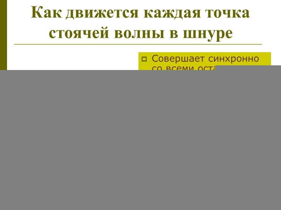 Как движется каждая точка стоячей волны в шнуре Совершает синхронно со всеми остальными точками гармонические колебания Колеблется перпендикулярно длине покоящегося шнура Колеблется с периодом равным периоду внешнего возмущения Имеет собственную амплитуду колебаний